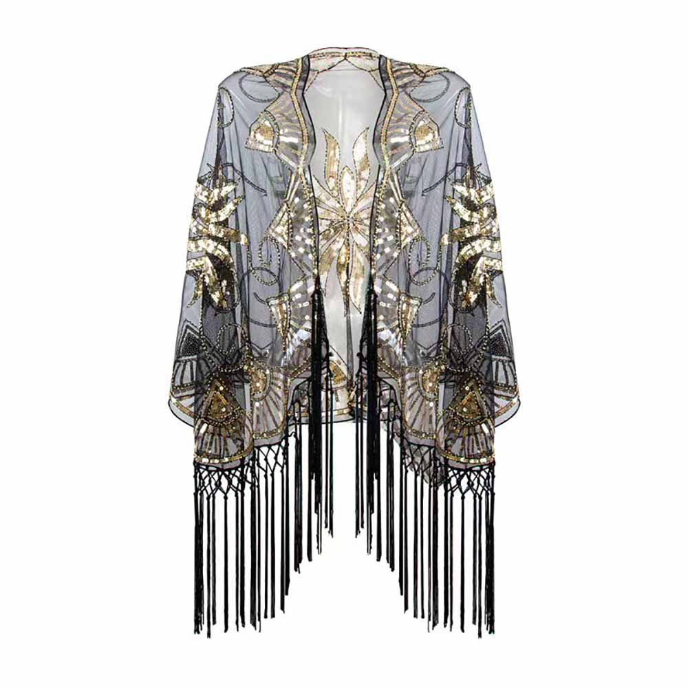 Open front wrap with fringed hem design and blinking decorative sequins, match perfectly with your 1920s flapper outfit, charming with any other types of dresses, sweater, shirts, etc.