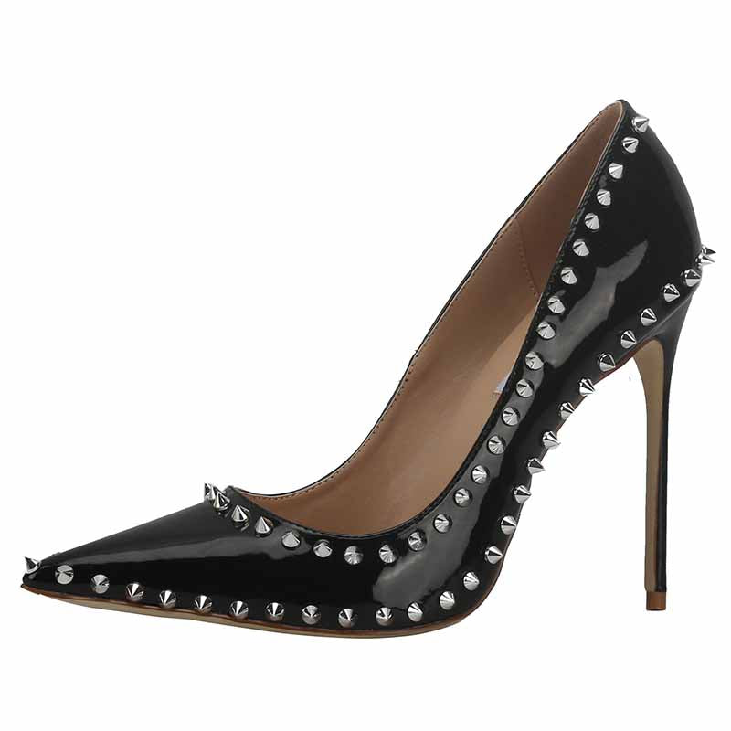 Black Rivet Studded Pointed Toe Slip on Sexy High Heel Pump Shoes