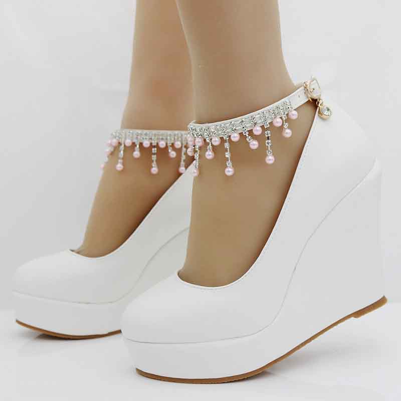 White Bridal Wedding Shoes Platform Wedges Pumps Round Toe Platform Heels