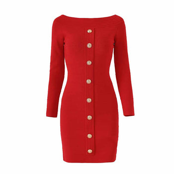 Women Knitted Mini Red Dress Ladies Long Sleeve Mini Knitted Dress
