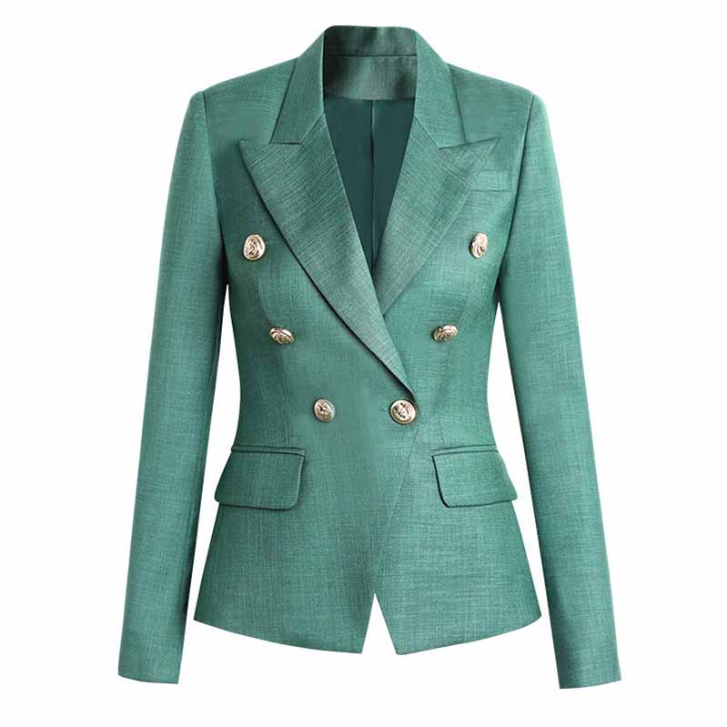Women's Teal Green Textured Luxury Fitted Double Breasted Blazer with Lion Buttons - SLIM FIT