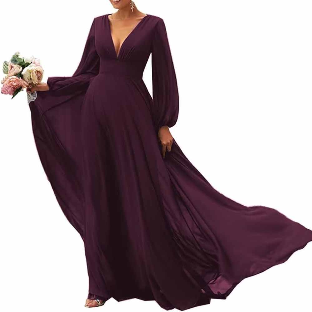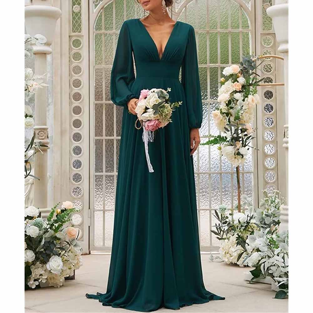 Long Sleeve V-Neck Chiffon Bridesmaid Dresses A Line Prom Dress Evening Gowns