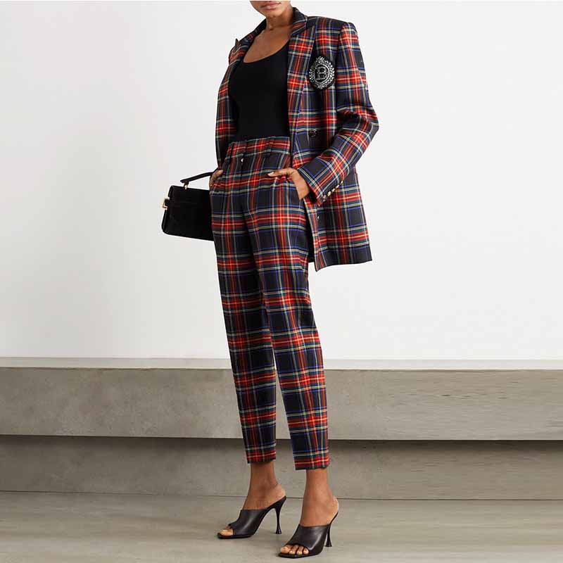 Plaid Print Double Breasted Suit Checked Ladies Pantsuits