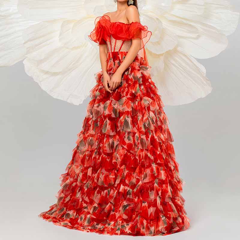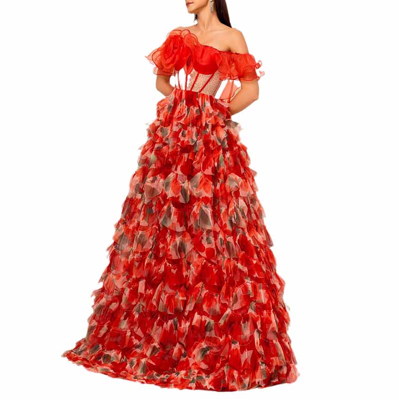 Straples Corset Appliqued Ruffled Tulle Prom Dress