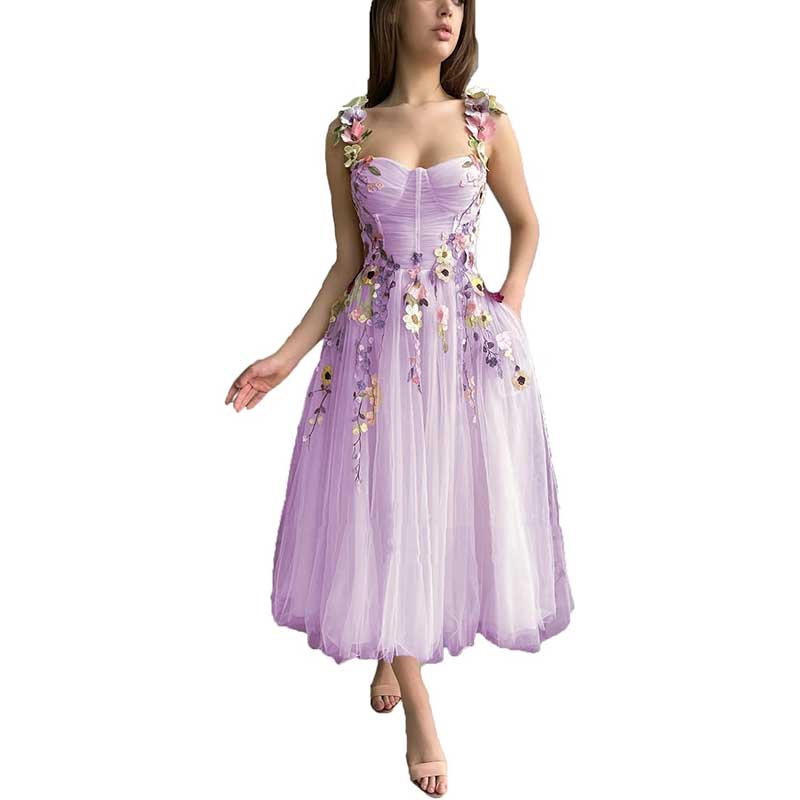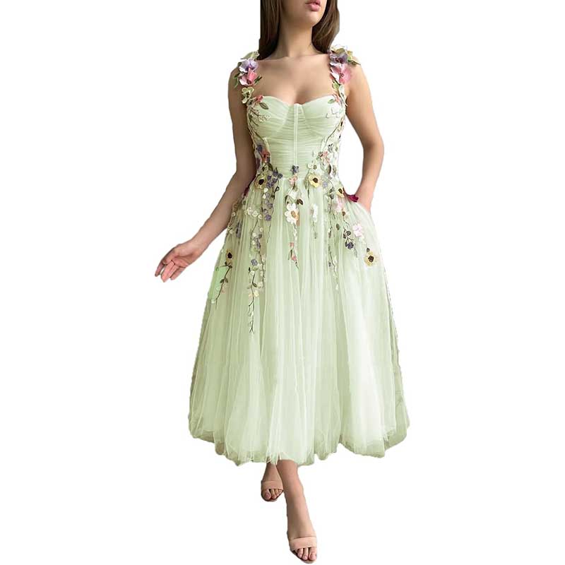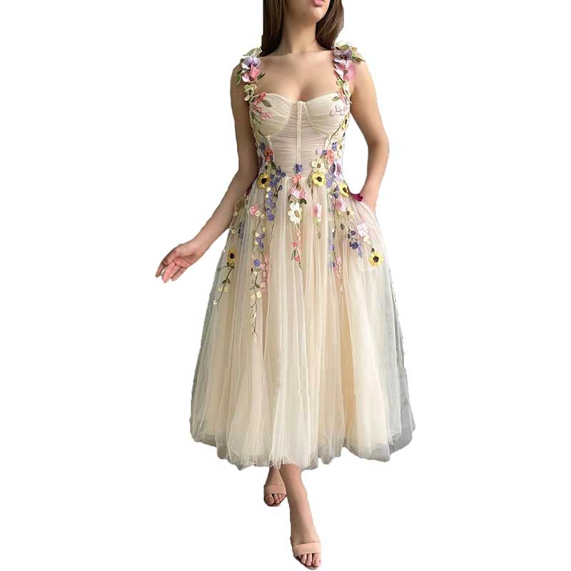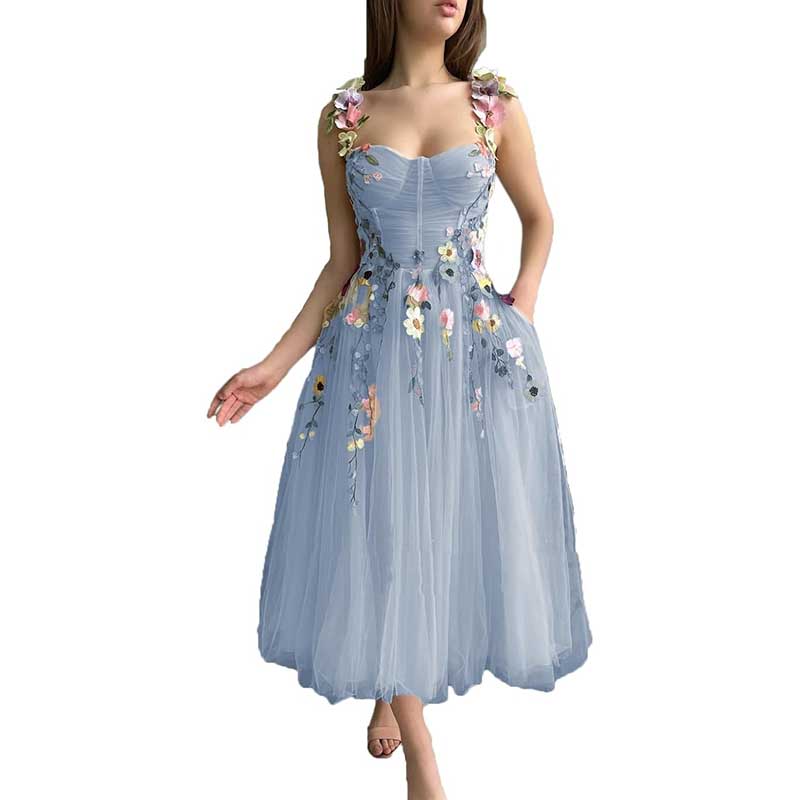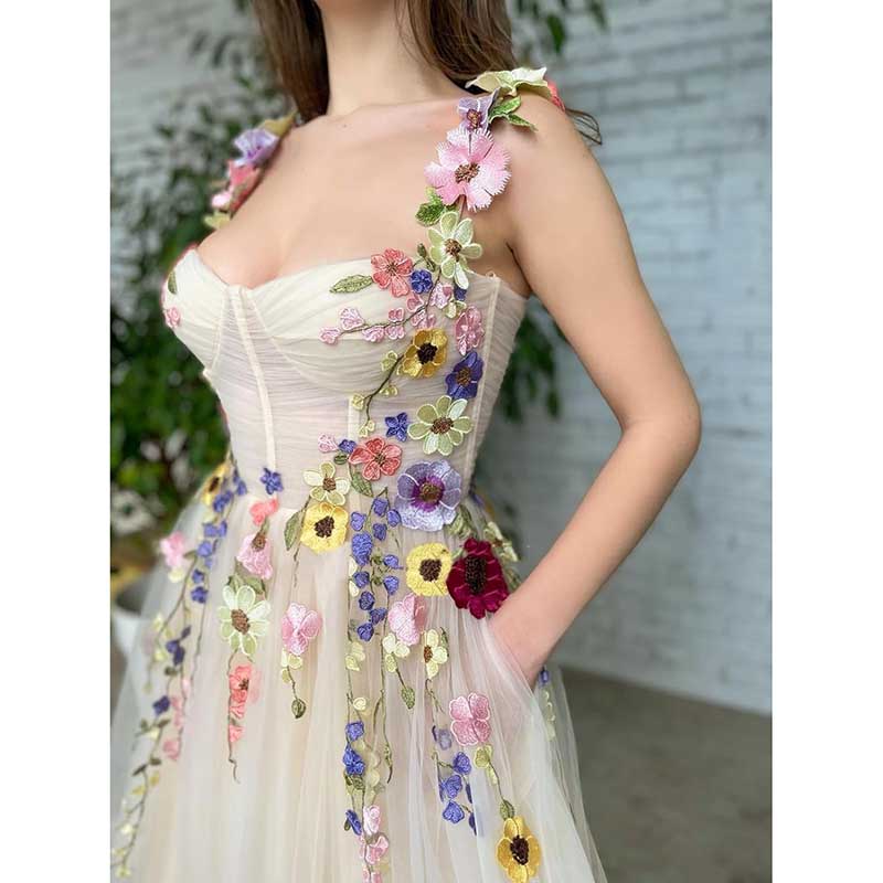 Women's 3D Flower Spaghetti Strap Prom Dress A-line Sweetheart Wedding Party Dress