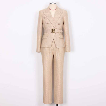 Women's Camel Pantsuit Gold Button Tie Belt Double Breasted Two Pieces Jacquard Suit