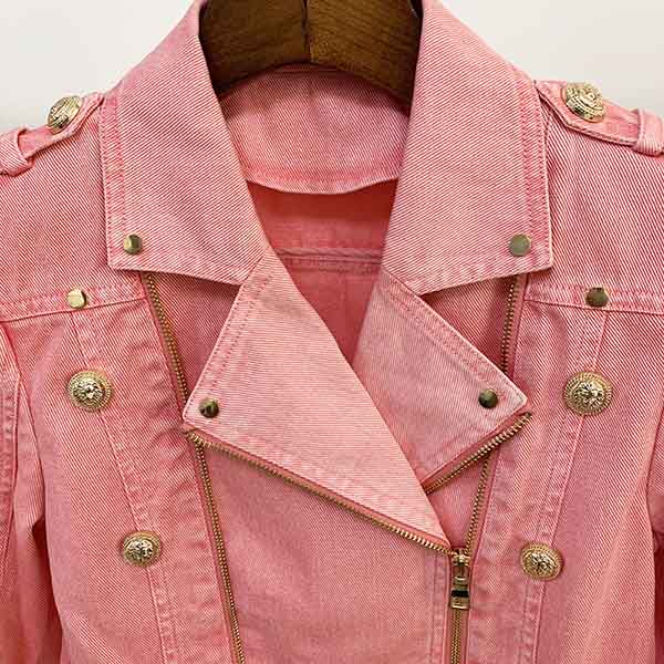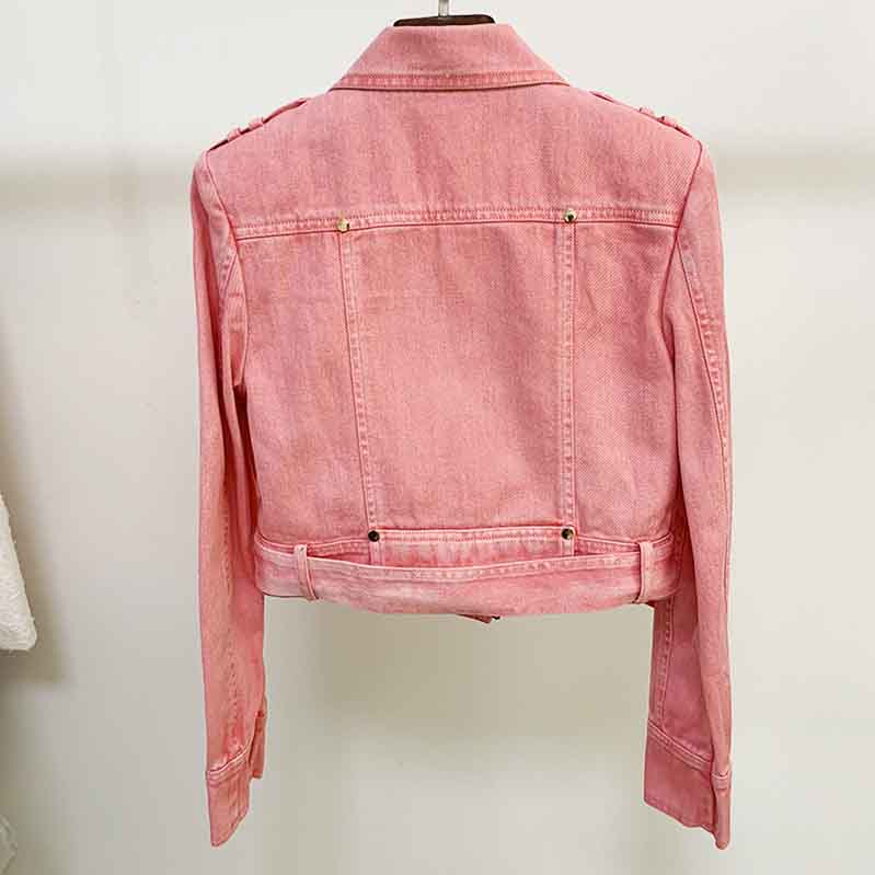 Women's Golden Lion Buttons Belted Denim Biker Jacket Coat Pink