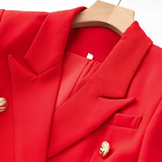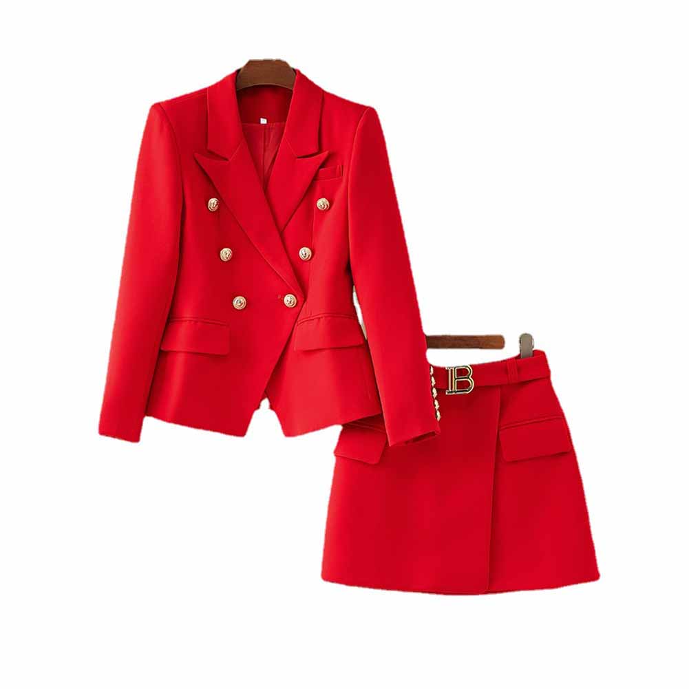 Women's Golden Lion Buttons Red Skirts Blazer Suit Jacket + High Waist Skirts Belt Suit