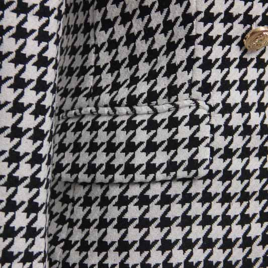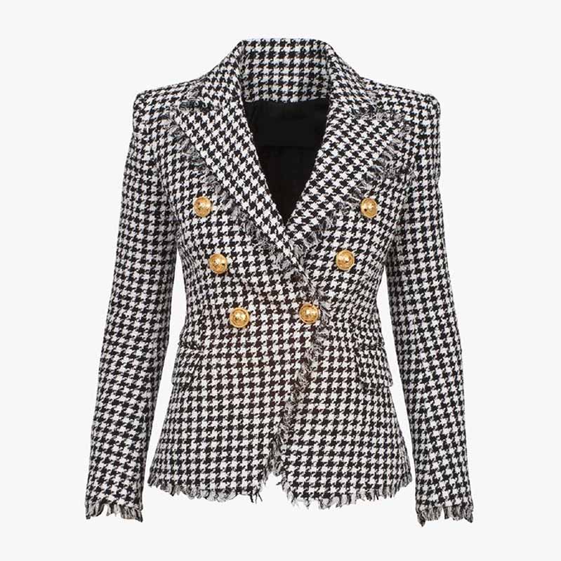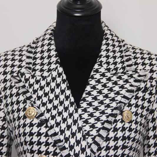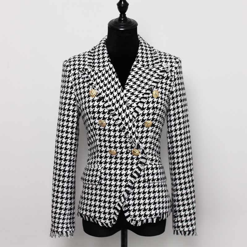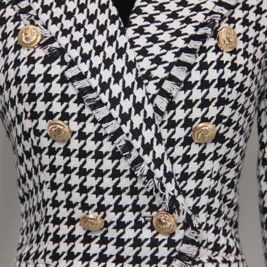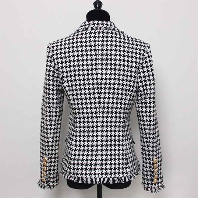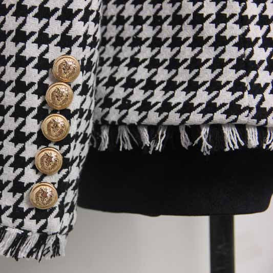 Womens Houndstooth Check Coat Fitted Fringe Tassel Golden Lion Buttons Blazer Jacket