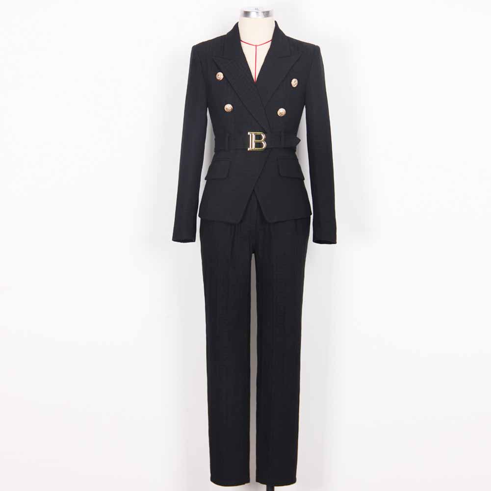 Women's Pantsuit Gold Button Tie Belt Double Breasted Two Pieces Jacquard Suit
