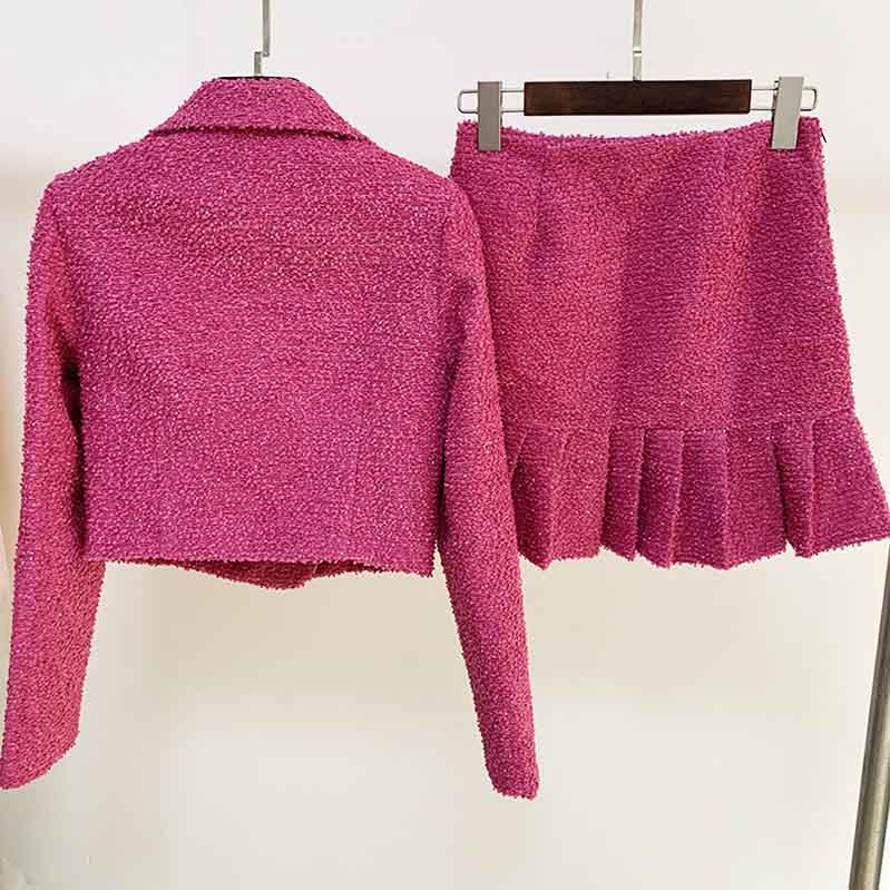 Womens Rose Pink Two Piece Short Coat with Long Sleeves + Short Skirt Formal Set