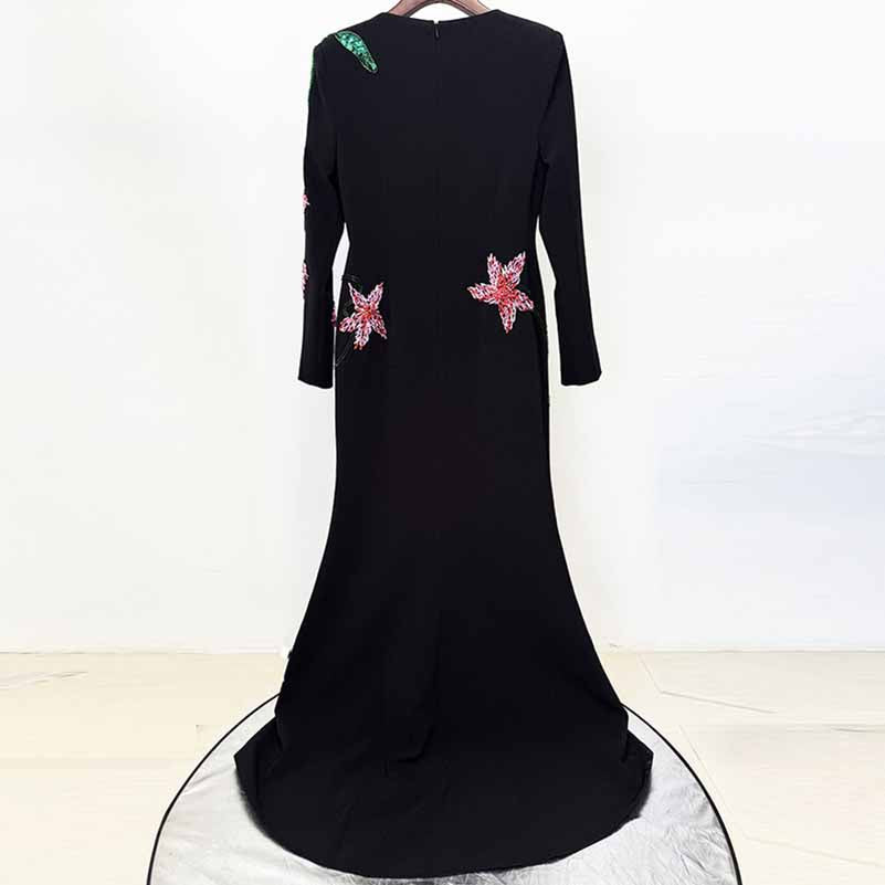 Boat Neck Sequin Floral Appliqué Long-Sleeve Black Gown – Elegant Evening Dress