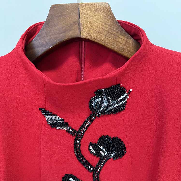 Cape Sleeve Red Sequin Beaded O-neck Long Sleeve Maxi Dress