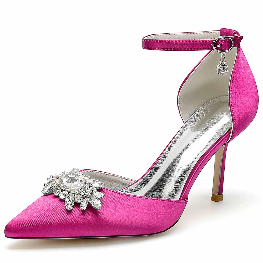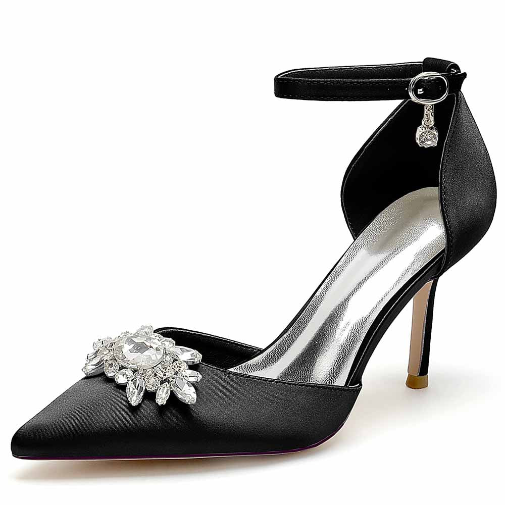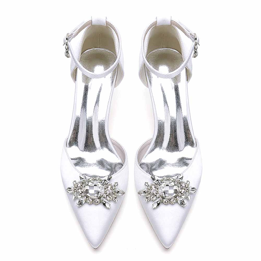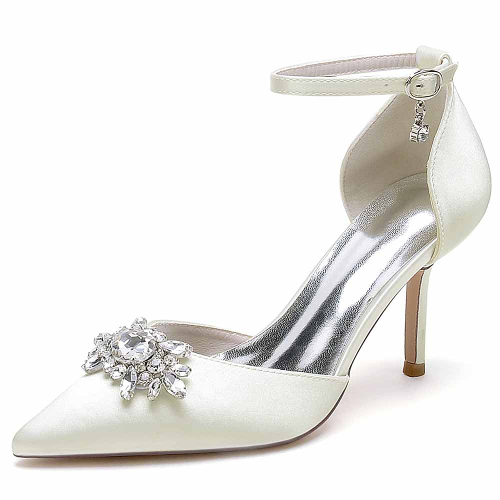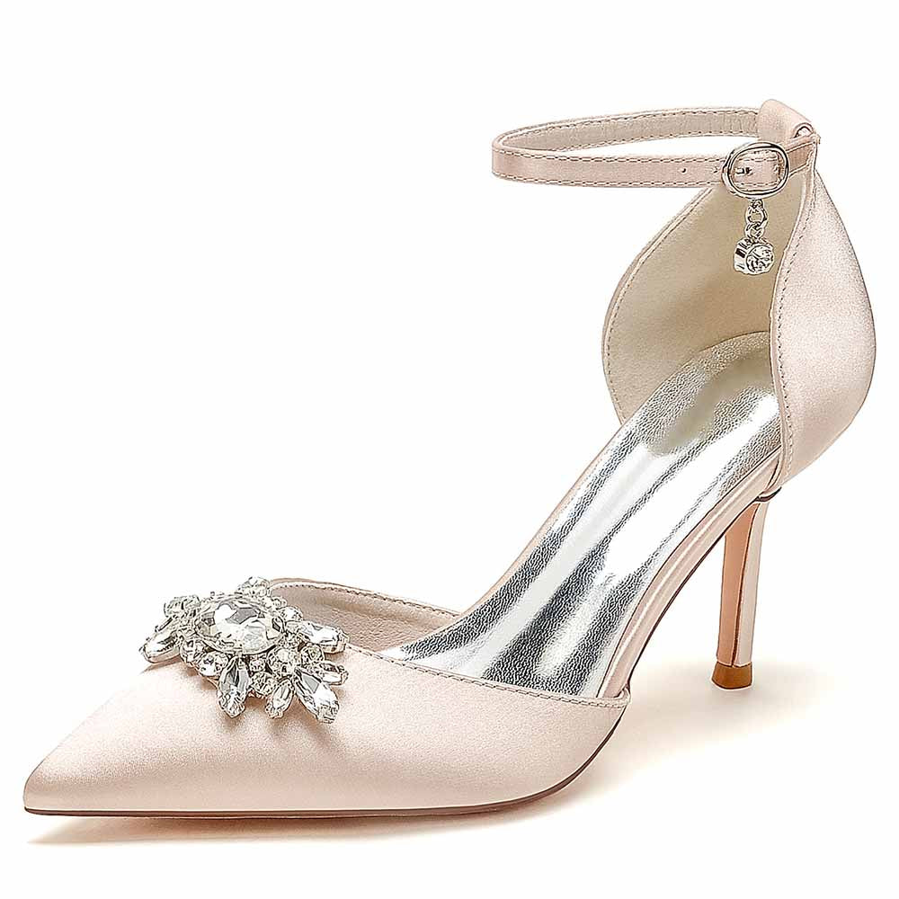 Closed Toe Wedding Shoes Satin Dress Heels Crystal Ankle Strap Pumps