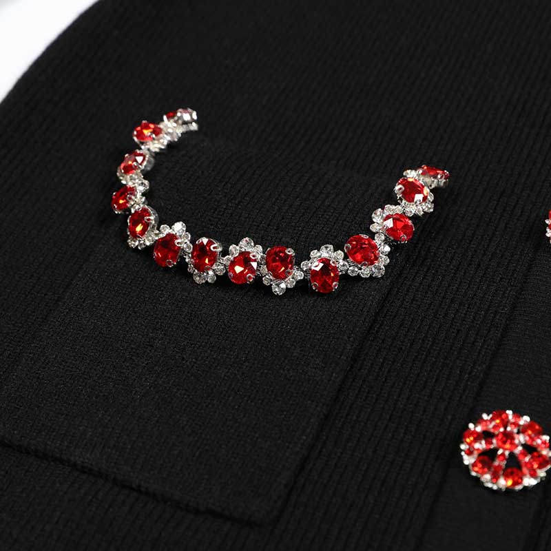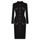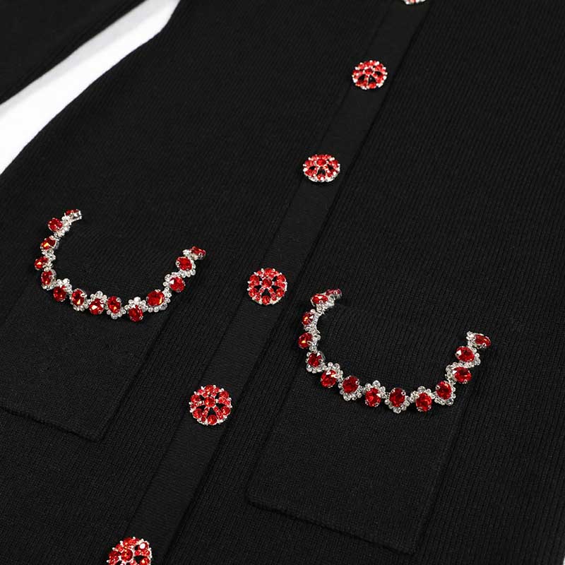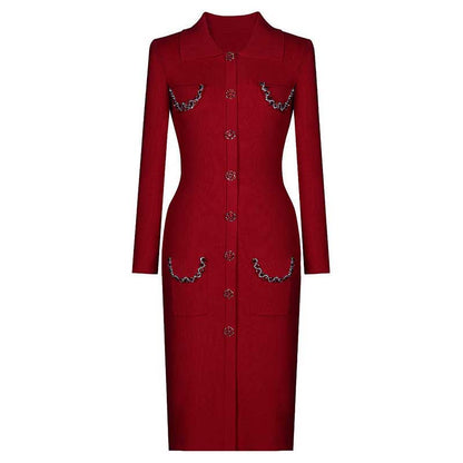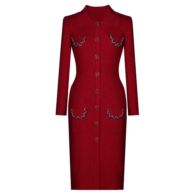 Collared Long Sleeves Knitted Midi Dress With Beaded Trim and Buttoms