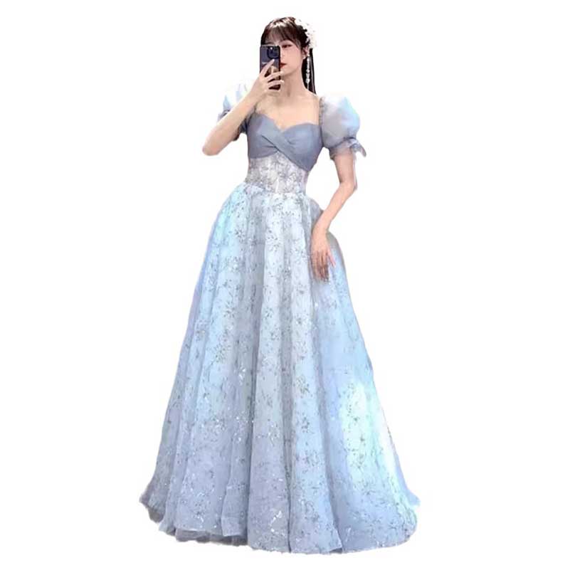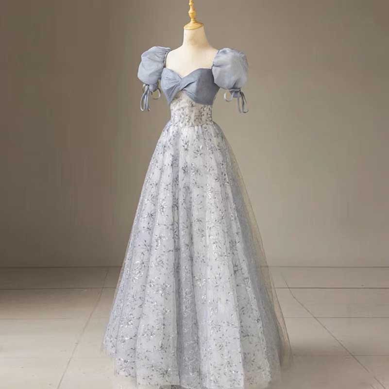 Dusty Blue Tulle Prom Dress Sparkly Floral Homecoming Dress With Puffed Sleeves