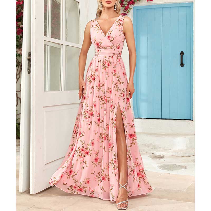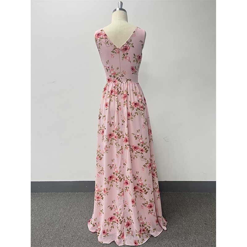 Floral Long Prom Dress High Split Pink Bridesmaid Dress Chiffon A Line Dress