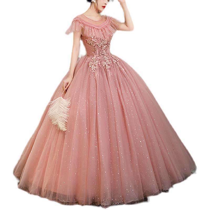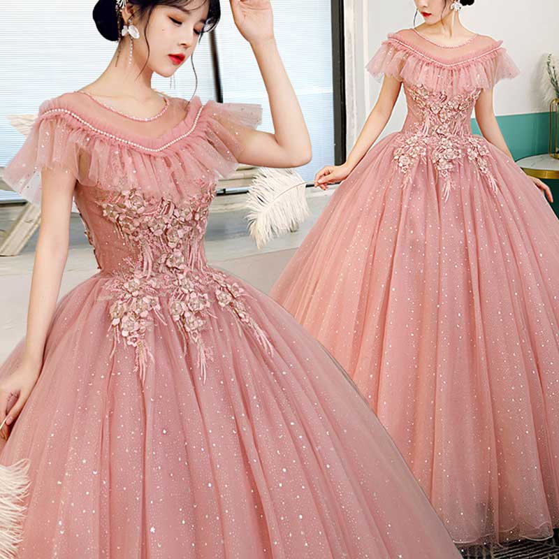 Laced Round-Neck Pink Ball Gown With Appliques
