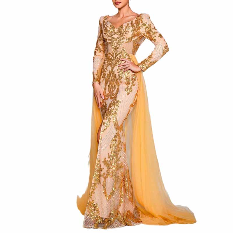 Long Sleeve Split Gold Sequin Maxi Dress Wedding Ball Gown