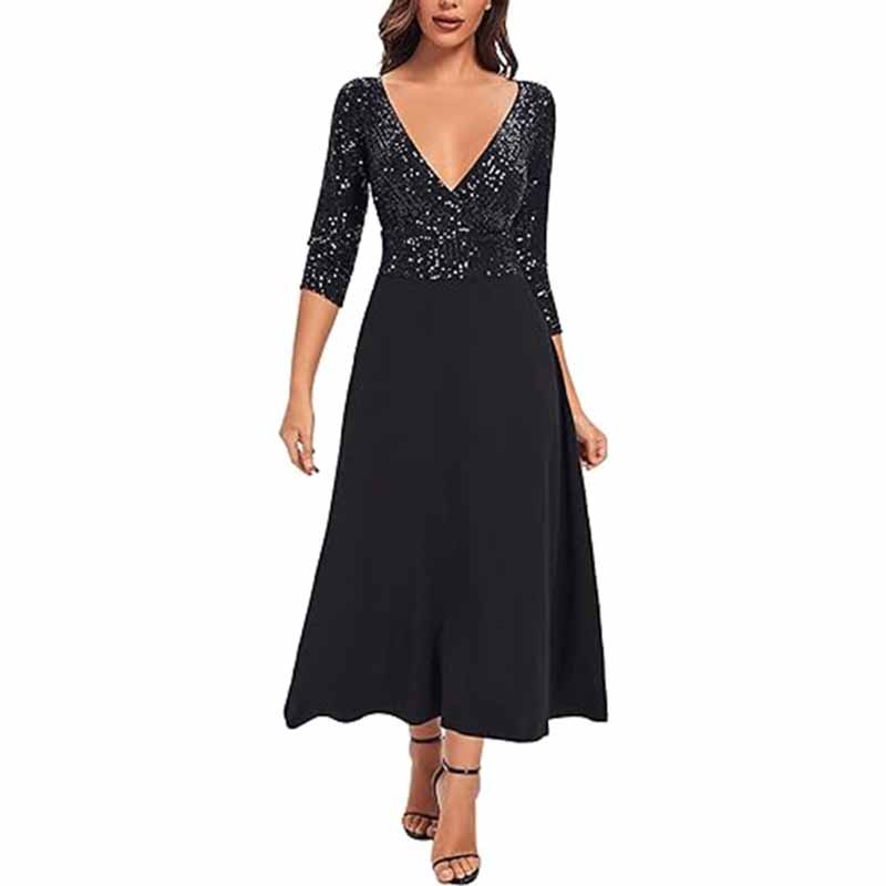 Long Sleeves Sequin Prom Dress V Neck Maxi Cocktail Dress