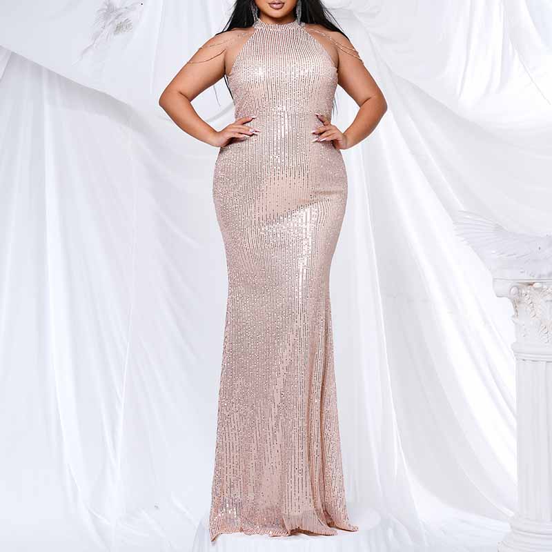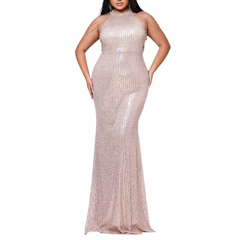 Plus Size Gold Sequin Bridesmaid Halter Dress Mermaid Long Prom Ball Gown