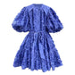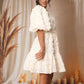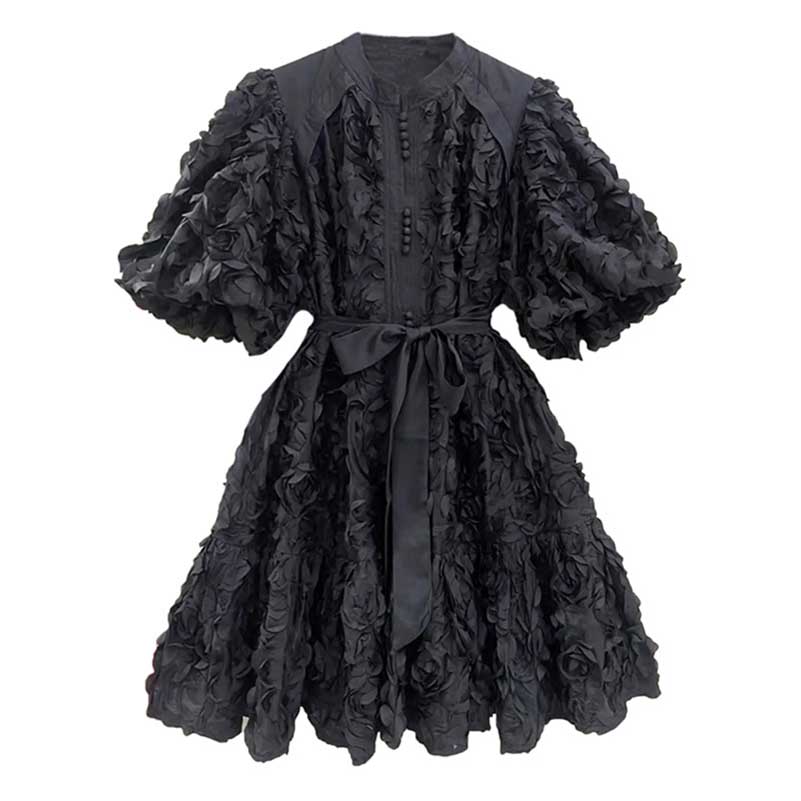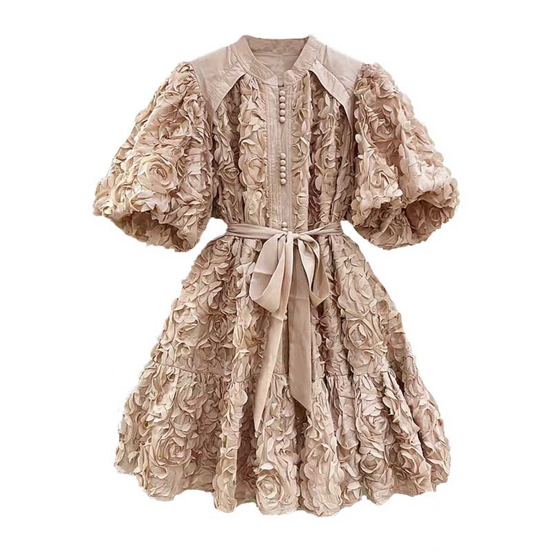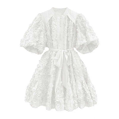 Puff Sleeve Flower Embellished Lace-Up Mini Dress