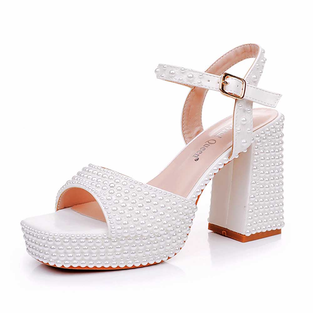 White Platform Wedding Shoes Pearls Bridal Sandals Chunky Prom Heels