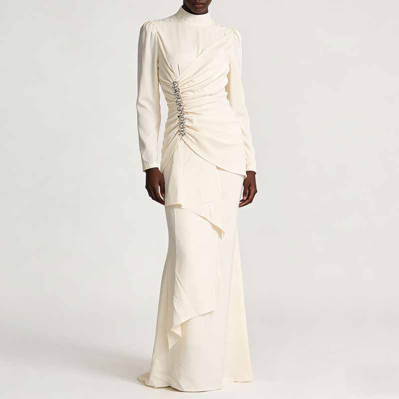 Women’s Long Sleeve Formal Dress – Stand-Up Collar, Hand Beaded Detail