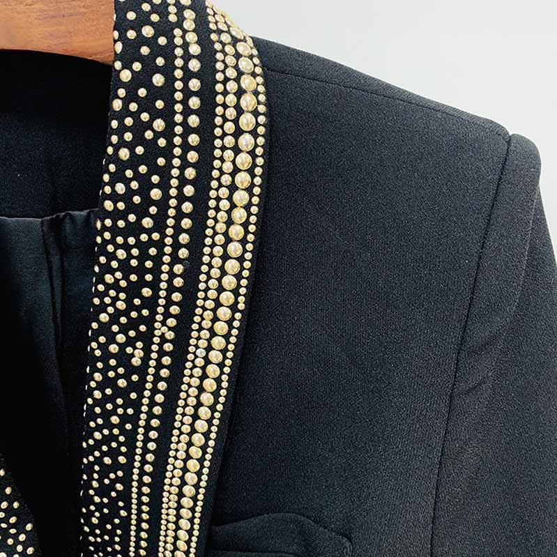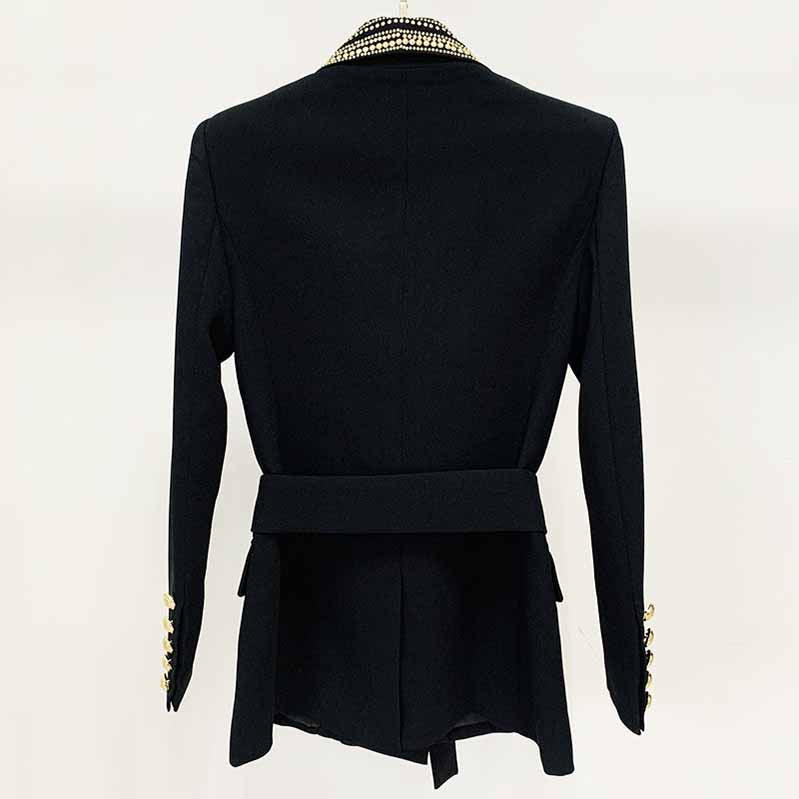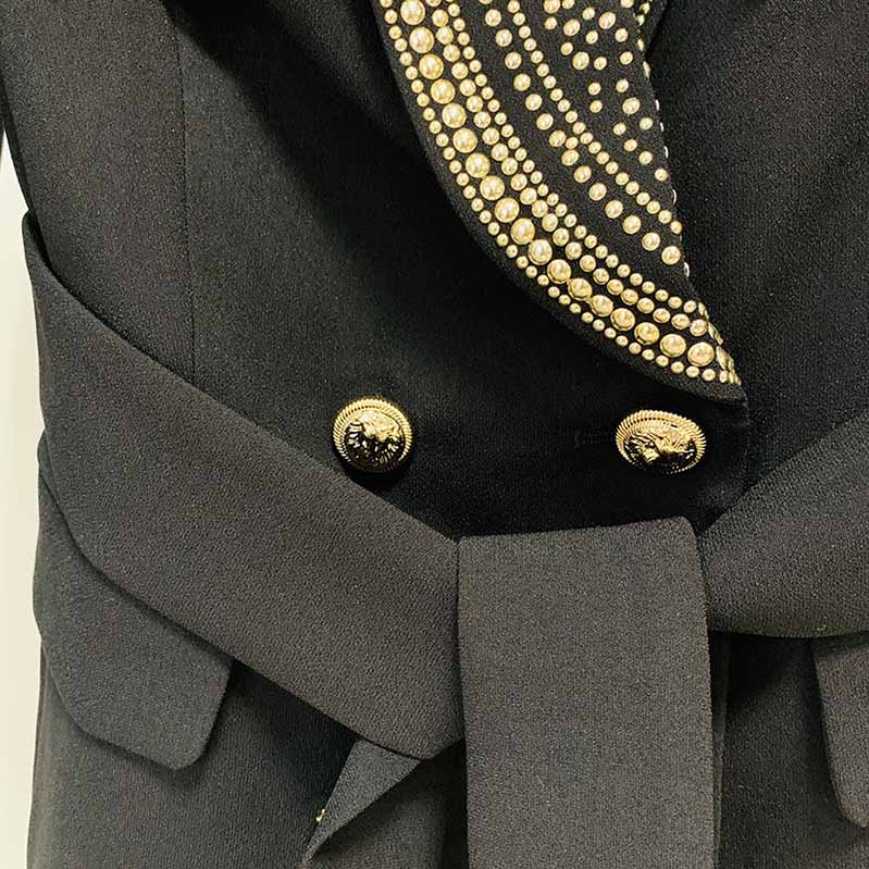 Womens Black Metal Coat Double Breasted Lion Button Blazer with Belt Outwear