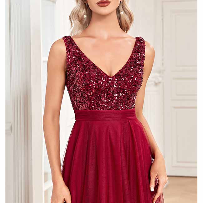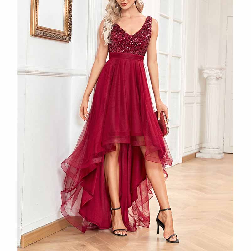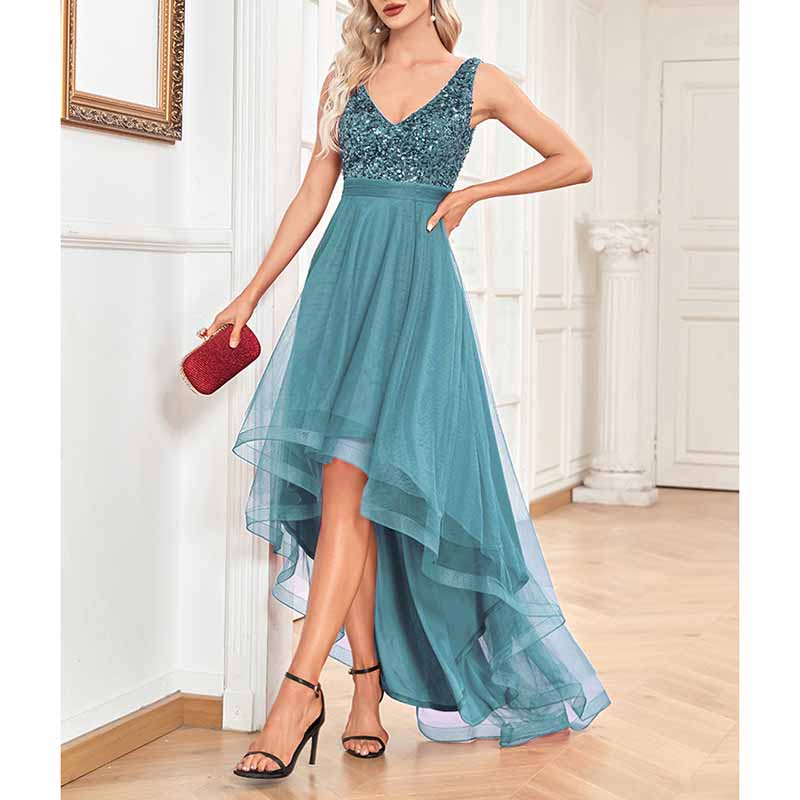 Womens Double V Neck High Low Sequin Tulle Plus Size Formal Evening Dresses