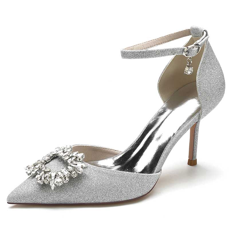 Women's Pointed Toe Rhinestone Pumps Glitter Ankle Strap Wedding Dress Shoes
