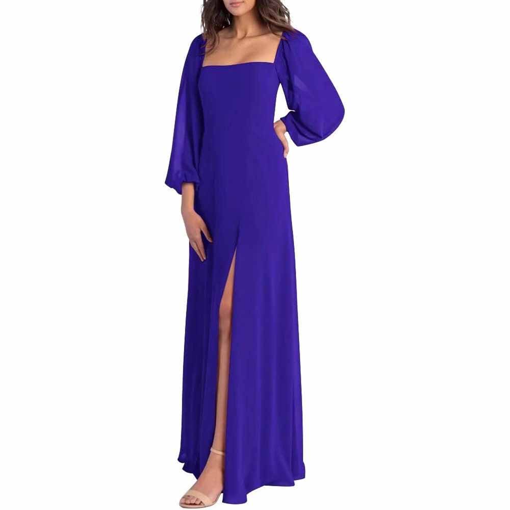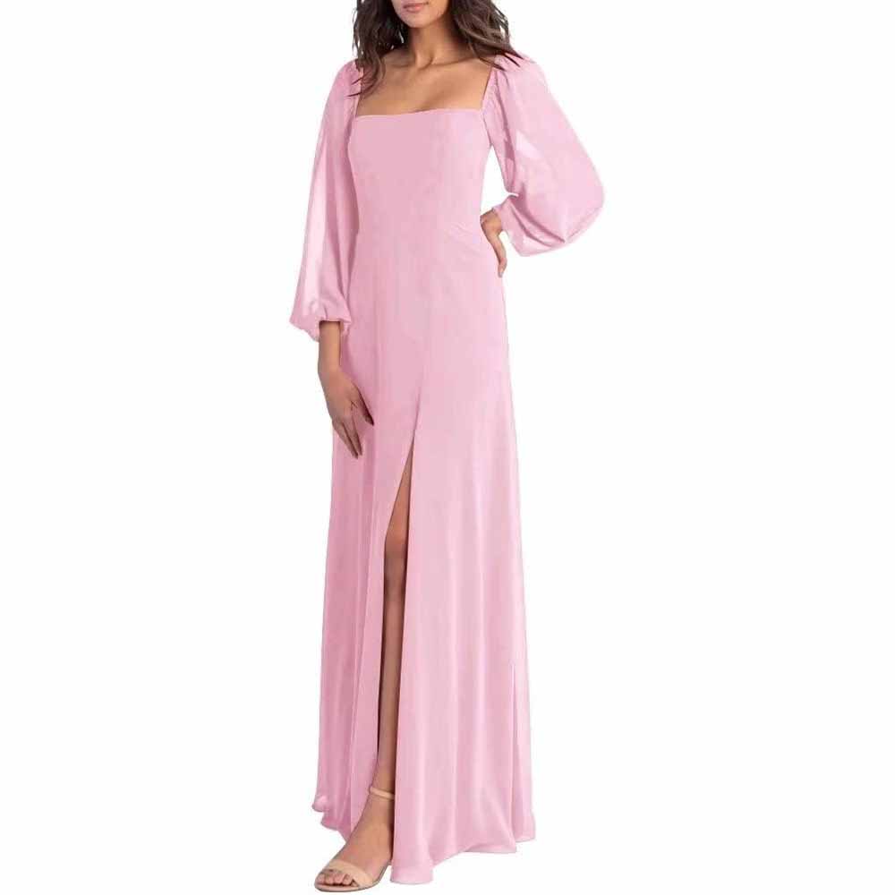 Women's Square Neck Long Sleeve Chiffon Bridesmaid Dresses High Slit Prom Dresses